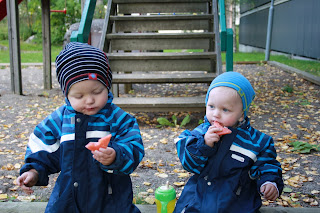 Gutte er superstolte over at de endelig klarer å komme seg opp på spisestuestolene helt på egen hånd!